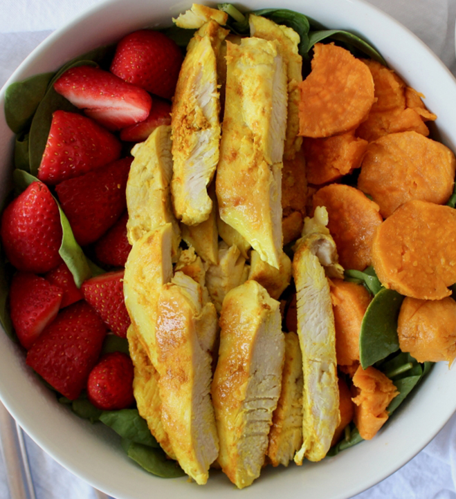 - Ajouter les épinards dans un grand bol à salade. Placez la patate douce, le poulet et les fraises par-dessus.