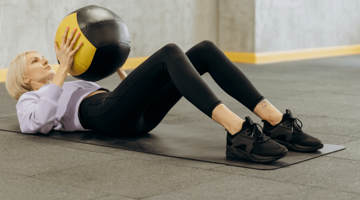 1. Commencez en position assise, à plat sur le dos, en tenant le ballon médicinal contre le sol et au-dessus de votre tête.